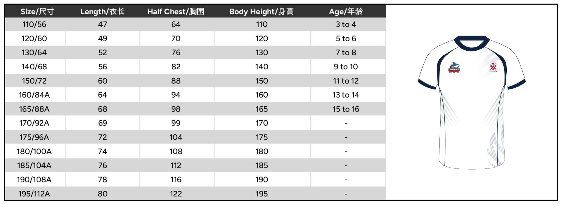 Size 110 or 120 or 130 or 140 or 150 or 160 or 165 or 170 or 175 or 180 or 185 or 190 or 195