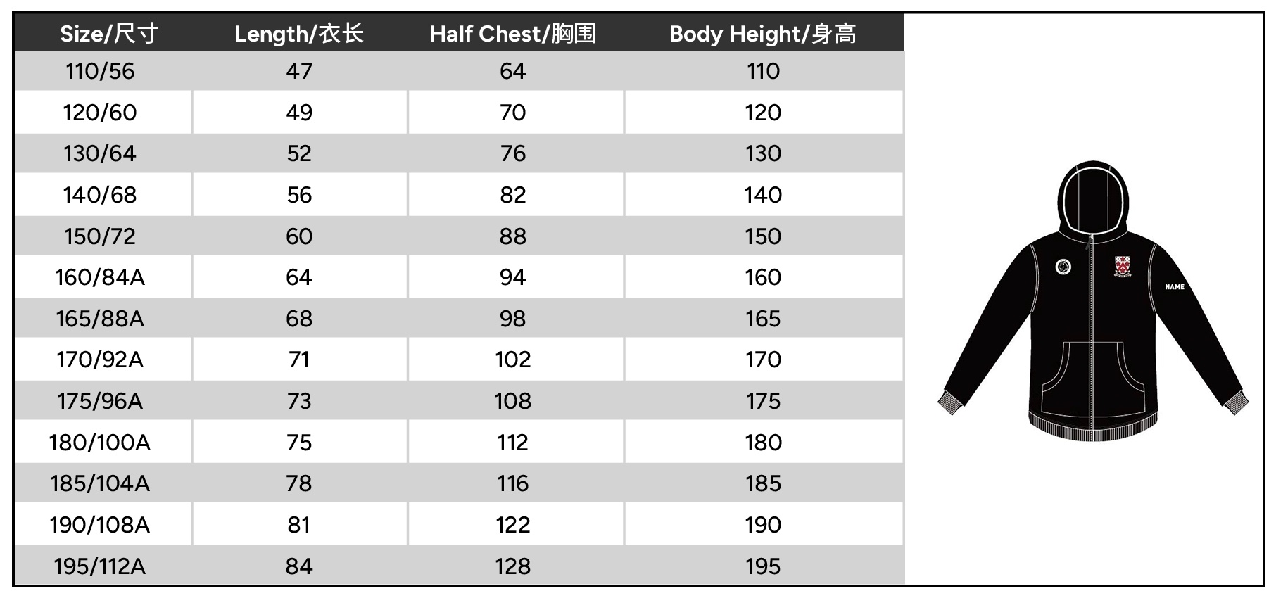 Size 110 or 120 or 130 or 140 or 150 or 160 or 165 or 170 or 175 or 180 or 185 or 190 or 195