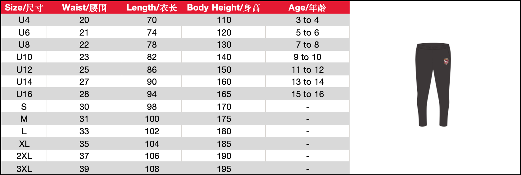 | Size | KS(U4) or KM(U6) or KL(U8) or JS(U10) or JM(U12) or JL(U14) or XS(U16) or S or M or L or XL or 2XL or 3XL |