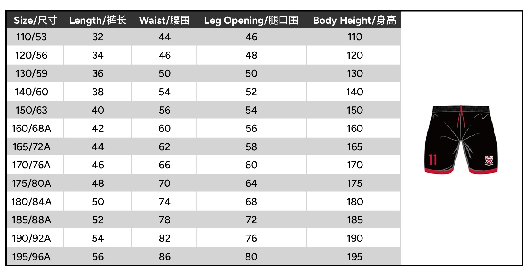 Size 110 or 120 or 130 or 140 or 150 or 160 or 165 or 170 or 175 or 180 or 185 or 190 or 195
